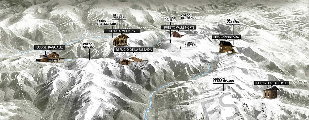 Baguales Mountain Reserve is a cat skiing destination located in the Río Negro Province of Argentina, just an hour from Bariloche City. The reserve offers high-quality snow and diverse terrain, making it suitable for all types of skiing. Visitors can enjoy cat skiing, heli skiing, and touring, with options for multi-day trips and overnight stays at a rustic mountain lodge. The reserve is situated in the Nahuel Huapi National Park, offering breathtaking landscapes and unique pristine forests and canyons to explore.