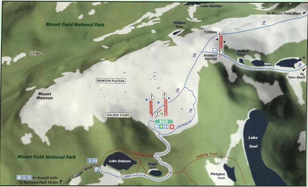 Mount Mawson is a ski resort located within the Mount Field National Park in southern Tasmania, Australia. It offers 4 km of slopes and 7 lifts, including three T-Bars and four Poma lifts, catering to skiers of all levels. The resort is situated about 1.5 hours drive from Hobart and has an elevation of 1,230 meters.