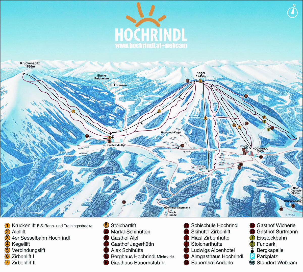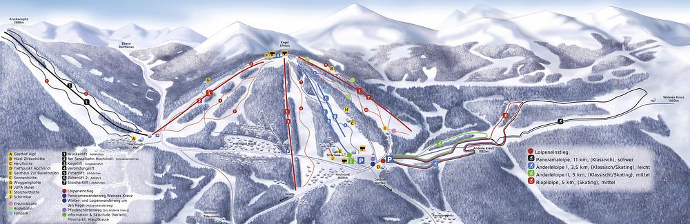 Hochrindl is a family-friendly ski resort in the Austrian Alps, nestled in the picturesque Carinthian Nock Mountains. With 20 km of well-groomed slopes, it offers a varied skiing experience for all levels. The resort features a modern 4-passenger chairlift, 5 ski tows, and a relaxed atmosphere, making it an ideal destination for families and beginners. The highest point reaches 1,617 meters, and the ski area is surrounded by dense woodland, scented meadows, and crystal-clear mountain air.