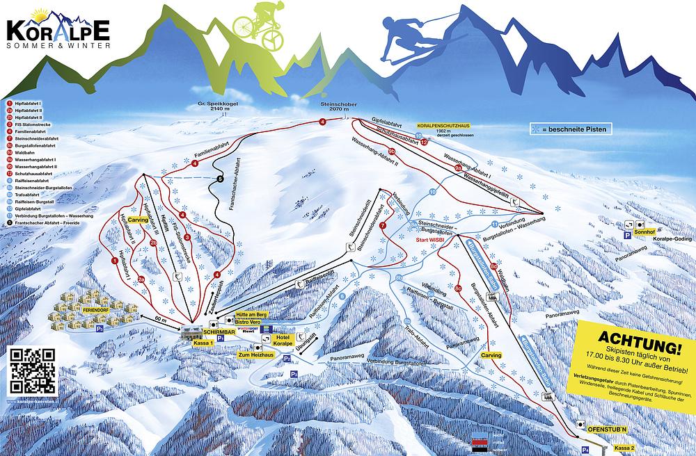 Koralpe is a ski resort located in Wolfsberg, Austria, offering 24 km of slopes with varying difficulty levels, spanning from 1,535 to 2,070 meters in altitude. The resort caters to all skill levels, with deep snow slopes and a range of winter activities, including skiing, snowboarding, and tobogganing. It's situated 15 km from the village center and offers a variety of accommodations, including hotels and cottages.