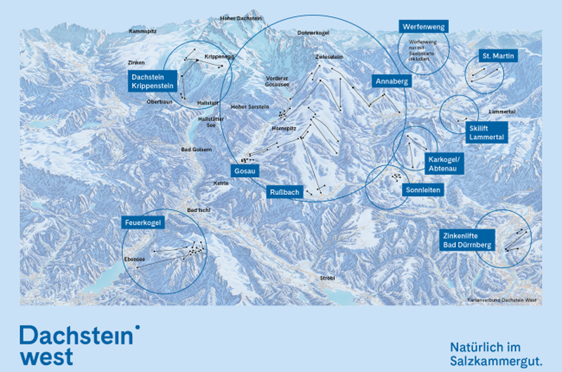 Here is a 50-100 word summary of Skiregion Dachstein West: Located in Gosau, Russbach, and Annaberg, Austria, Skiregion Dachstein West offers 160 kilometers of slopes for skiing and snowboarding. The region boasts a breathtaking mountain panorama, perfect slopes, and modern lift facilities. With 46 ski lifts and gondolas, skiers can access over 150 km of pistes. The region is suitable for intermediate and advanced skiers, with mostly red pistes and some decent side country skiing after good snowfall. The ski area is part of the larger Ski amadé region and offers a variety of amenities, including restaurants, ski schools, and accommodations.