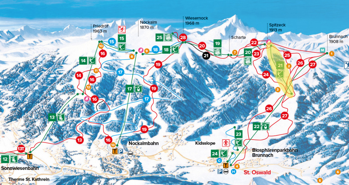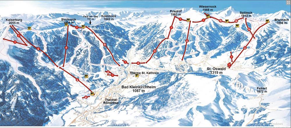 Skigebiet Bad Kleinkirchheim is a ski resort located in the Austrian state of Carinthia. It offers 103 km of pistes, divided into 11 km of blue, 84 km of red, and 8 km of black runs, catering to various skill levels. The resort is situated between 1,100 and 2,055 meters above sea level and features 24 lifts and 5 entry points. Visitors can enjoy a range of activities, including skiing, snowboarding, and hiking, as well as access to a thermal spa. The resort is part of the UNESCO Biosphere Reserve Kärntner Nockberge and is considered one of Austria's most popular ski resorts.