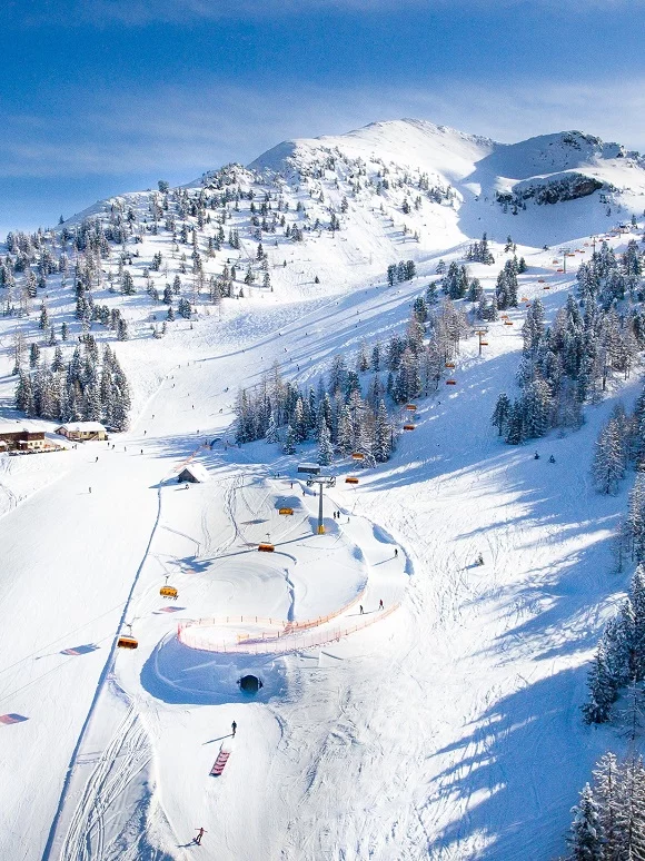 Hauser Kaibling is a ski area within the Schladming-Dachstein ski region in the Ennstal Alps, Austria. It's part of the Schladminger 4-Berge-Schaukel, four connected mountains, and offers 18 trails, a base elevation of 752 meters, and a summit height of 2,015 meters. The resort features a sports shop, ski school, and various trails for skiing, hiking, and biking. With 123 kilometers of groomed runs and 44 modern lifts, it's an ideal destination for skiers and hikers of all levels.