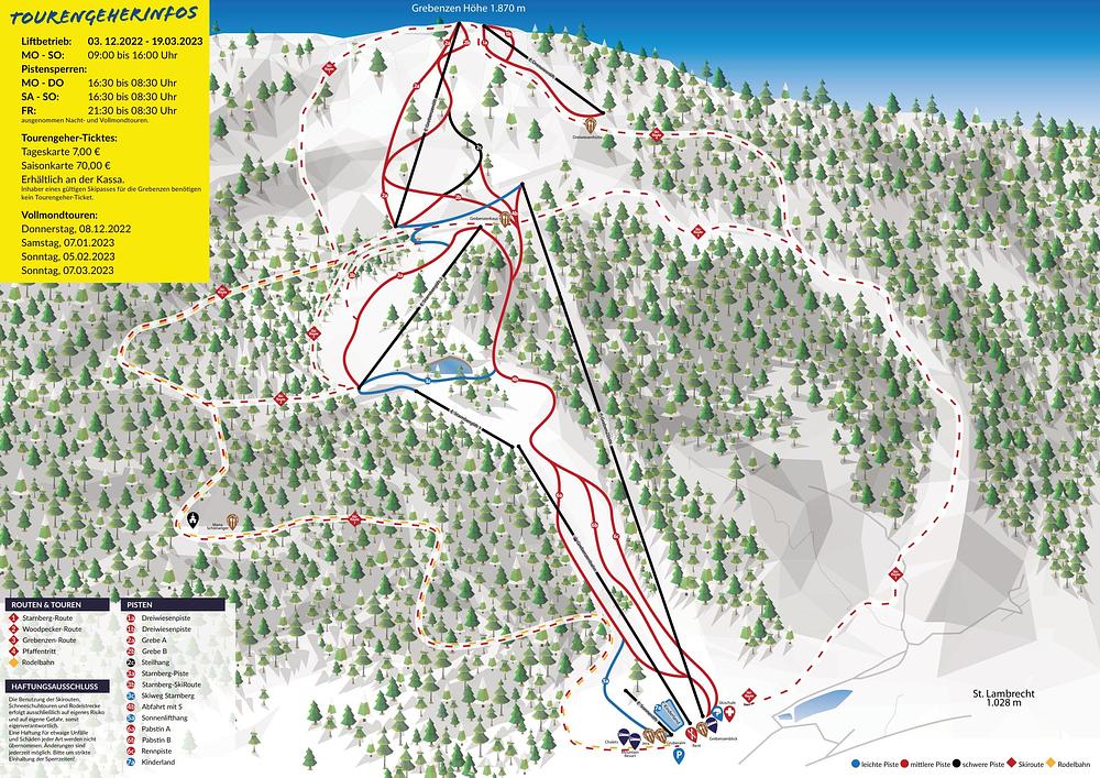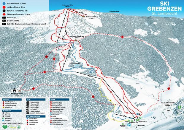 Skigebiet Grebenzen in St. Lambrecht, Austria is a ski resort with 25 kilometers of pistes, offering a variety of downhill runs and a range of amenities for winter sports enthusiasts. The resort extends up to 1,900 meters in elevation, with an average snow depth of 70 cm at the summit and 44 cm at the base. It features a chairlift and several tow lifts, as well as cozy ski huts and a summer toboggan run.