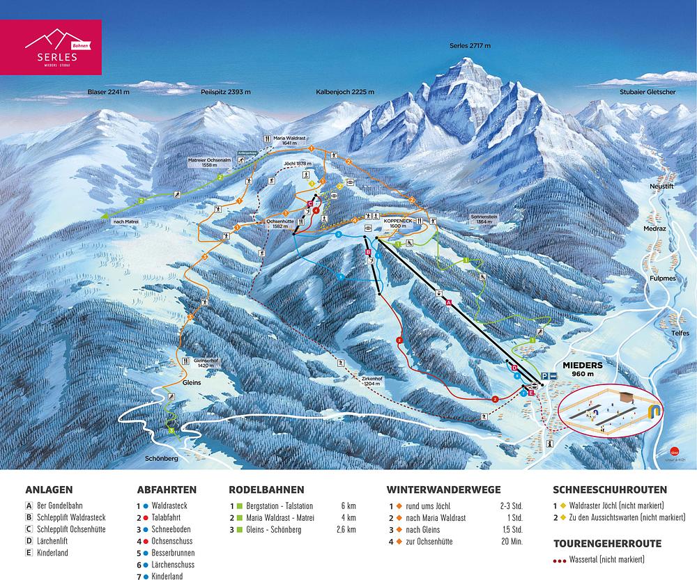 Serlesbahnen is a small but charming ski resort in Mieders, Austria, nestled in the Stubai Valley. With 6 kilometers of easy and intermediate slopes, it's perfect for beginners and families. The resort offers breathtaking views of the Stubai Valley and surrounding mountains. The slopes are well-groomed, and the atmosphere is pleasant, making it an ideal destination for those seeking a relaxed skiing experience.