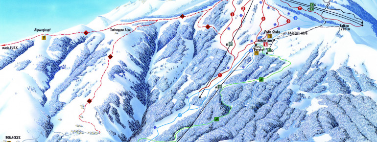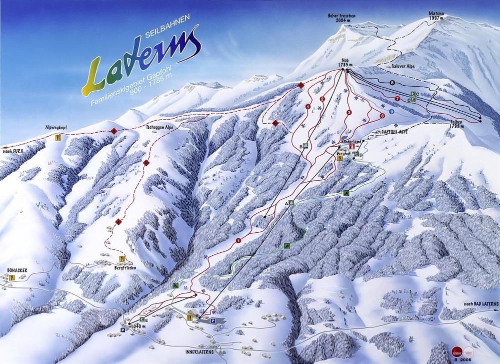 Laterns-Gapfohl is a medium-sized ski resort located in the Laterns valley in Vorarlberg, Austria. It offers 27 km of slopes, a 3000 m long natural toboggan run, and a variety of ski schools and guided tours. The resort is situated near the Rhine Valley and the Bregenz Forest, making it easily accessible by car. With 8 trails and a range of amenities, Laterns-Gapfohl is a popular destination for families and skiers of all levels.