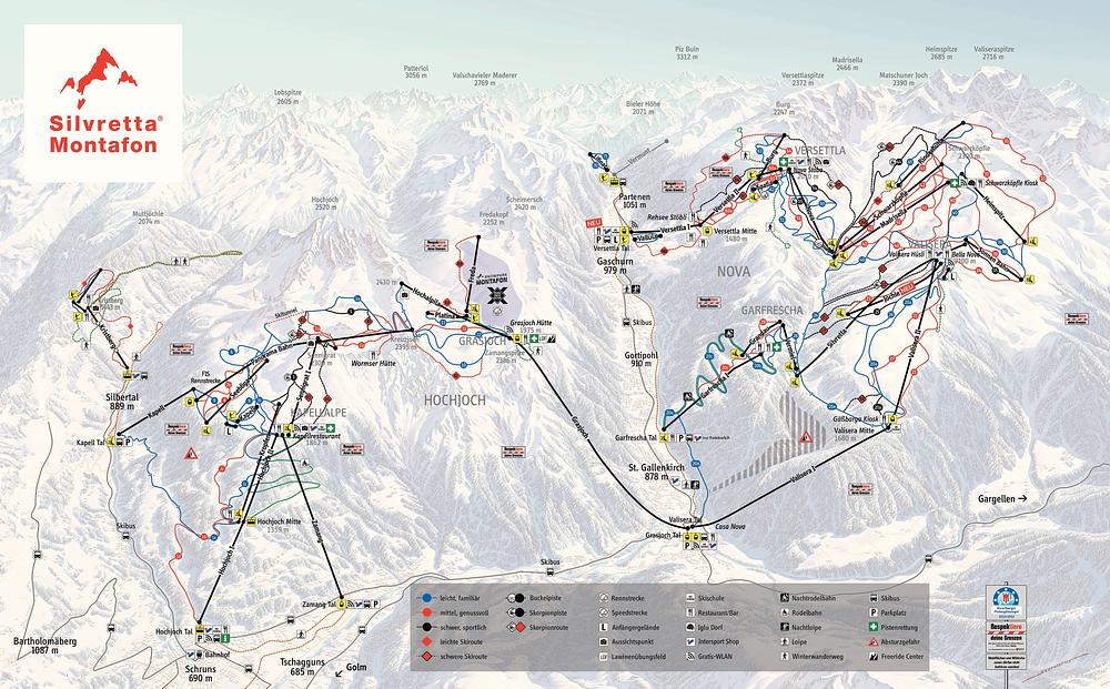 Silvretta Montafon is a ski resort located in the Vorarlberg region of Austria, offering a vast ski area with 140 kilometers of marked trails and 35 lifts. The resort caters to all skill levels, from beginners to experts, with a variety of slopes and freeride terrain. It's known for its stunning scenery, modern lifts, and abundant snowfall, making it a popular destination for skiers and snowboarders.