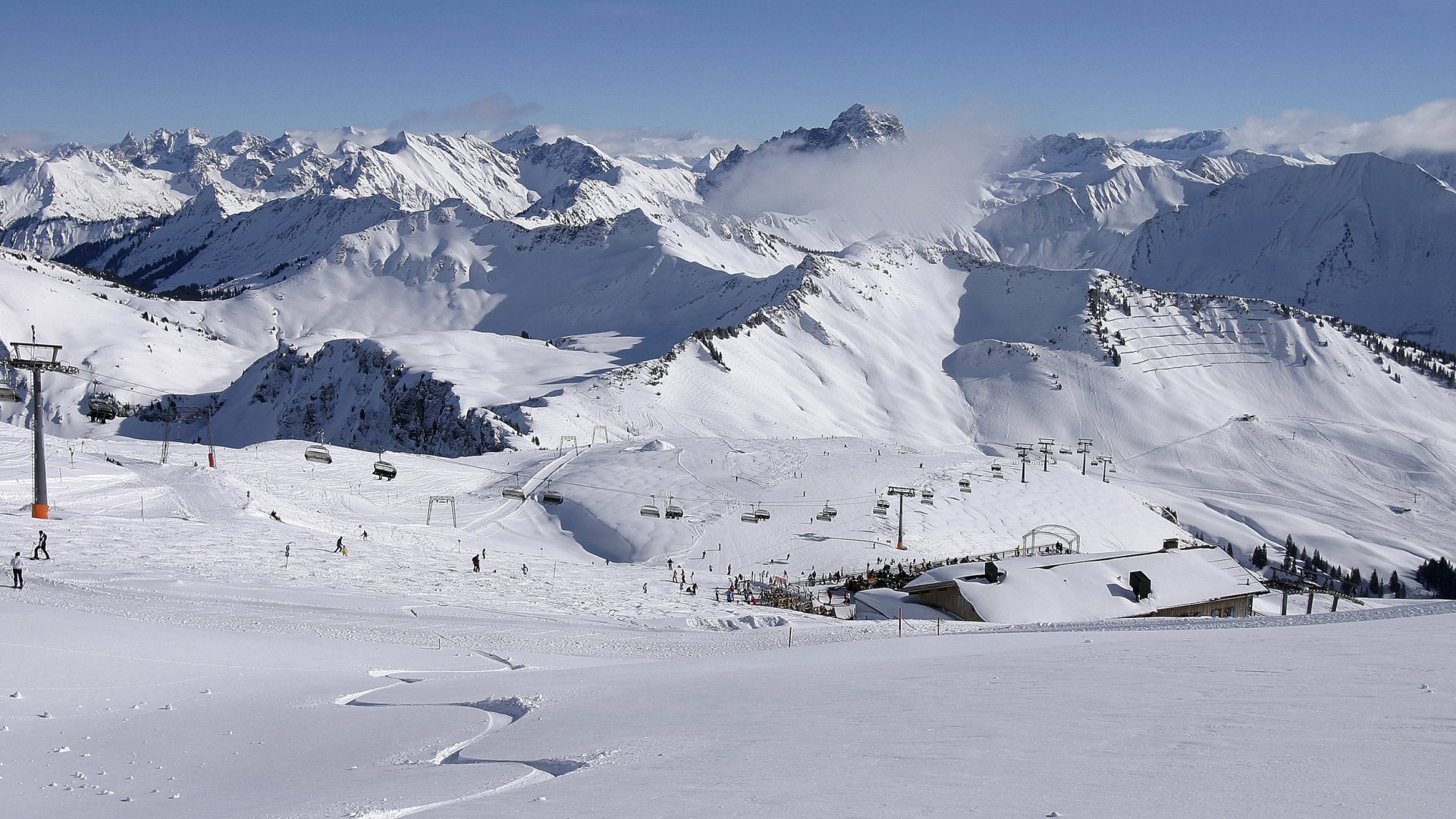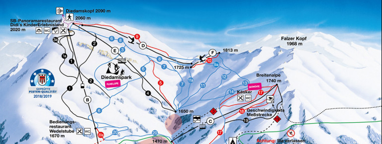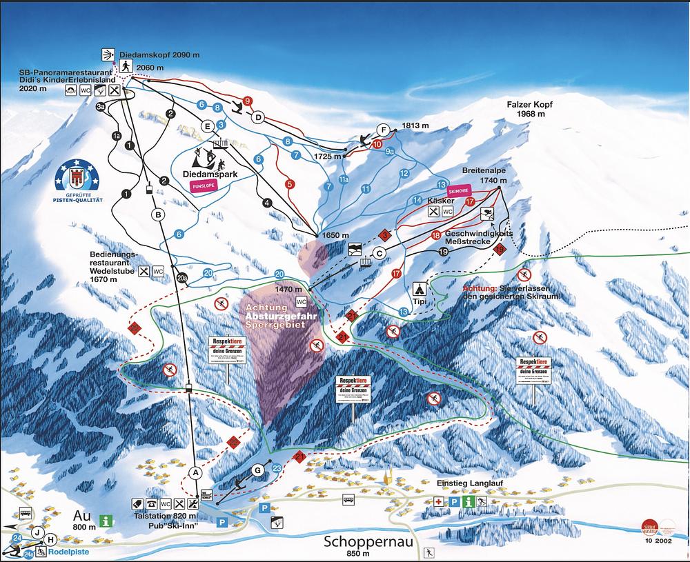 Located in the Bregenzerwald region of Austria, the Skigebiet Diedamskopf offers 44 km of slopes and runs, including an off-road area and a half pipe. The resort has a diverse range of terrain for all skill levels, with well-groomed natural snow slopes and a variety of trails. The Diedamskopf mountain itself stands at 2,090 meters high, offering breathtaking views of over 300 surrounding peaks. The resort is easily accessible by car or public transportation, and there are three restaurants on site to refuel.