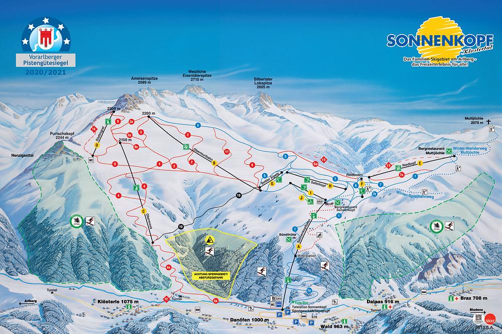 Sonnenkopf is a family-friendly ski resort located at the foot of the famous Arlberg in Austria. With an altitude of up to 2,300m, it offers a variety of runs and free ride opportunities. The resort is known for its good snow conditions, protected from the sun, and is a popular destination for both beginners and experienced skiers. It features 17 trails, a ski school, and a playground, making it an ideal spot for families.