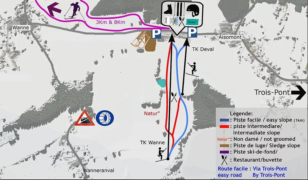 Ski Val de Wanne is a ski resort located in Trois-Ponts, Belgium, in the Province of Liège, Wallonia. It features 1.8 km of slopes, 2 lifts, and a restaurant at 500m altitude. The resort offers alpine skiing and cross-country skiing opportunities, with 2 slopes for beginners and experts alike. The area is also home to a recreational center with various activities, including a maze and go-karting.