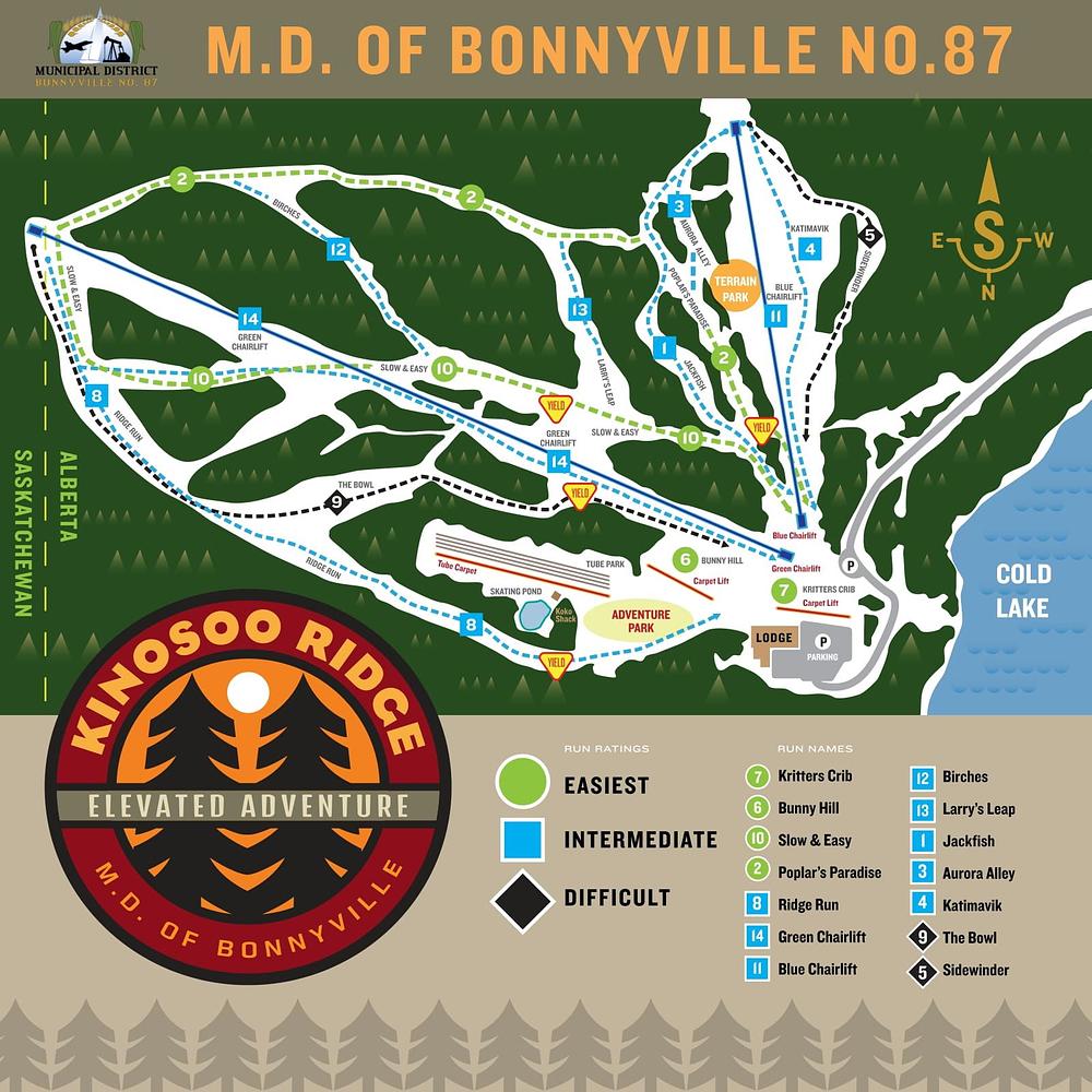 Kinosoo Ridge Resort in Cold Lake, Alberta, Canada, offers a year-round adventure experience. In the winter, it features 14 ski runs of varying difficulty, a four-lane Tube Park, and a main lodge. The resort caters to all skill levels, from beginner to advanced. In the summer, it transforms into an Aerial Adventure Park with breathtaking views of Cold Lake. With a range of activities, including skiing, snowboarding, and tubing, Kinosoo Ridge is a great destination for families and thrill-seekers alike.