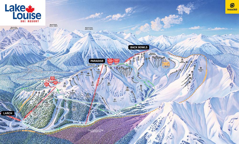 Here's a 50-100 word summary of Lake Louise: Located in Banff National Park, Alberta, Canada, Lake Louise Ski Resort offers 4,200 acres of skiable terrain across four mountain faces. The resort features 10 lifts, including a gondola and high-speed chairlifts, and caters to all skill levels. With over 1,700 hectares of skiable terrain, Lake Louise is one of the largest ski resorts in North America. The resort offers a range of amenities, including dining, shopping, and accommodations, making it a one-stop destination for winter sports enthusiasts. It's a popular destination for skiing, snowboarding, and sightseeing.