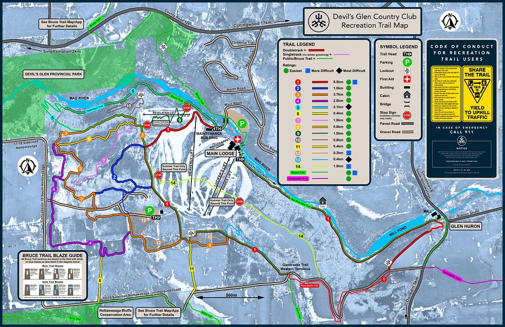 Devil's Glen Country Club is a private ski club nestled within the Niagara Escarpment on nearly 600 acres of countryside in Glen Huron, Ontario. The club offers a range of recreational amenities and services, including skiing, snowshoeing, and cross-country skiing. With state-of-the-art facilities and exceptional amenities, Devil's Glen provides an exclusive experience for its members. The club is located near Collingwood and Blue Mountain Village, making it an ideal destination for outdoor enthusiasts.