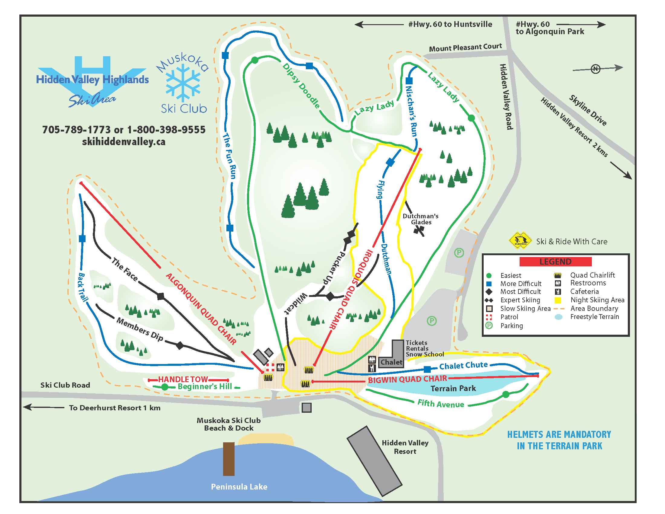 Here's a 50-100 word summary of Hidden Valley Highlands Ski Area: Located in Huntsville, Ontario, Canada, Hidden Valley Highlands Ski Area is Muskoka's only ski hill. With 15 groomed trails, three quad chairlifts, and a terrain park, it offers something for all skill levels. The ski area features gentle, cruising slopes for beginners and intermediates, as well as challenging runs for advanced skiers. Night skiing and snowboarding are also available. The resort offers lessons and rentals, and is a great destination for families and those looking for a fun winter experience in the heart of cottage country.