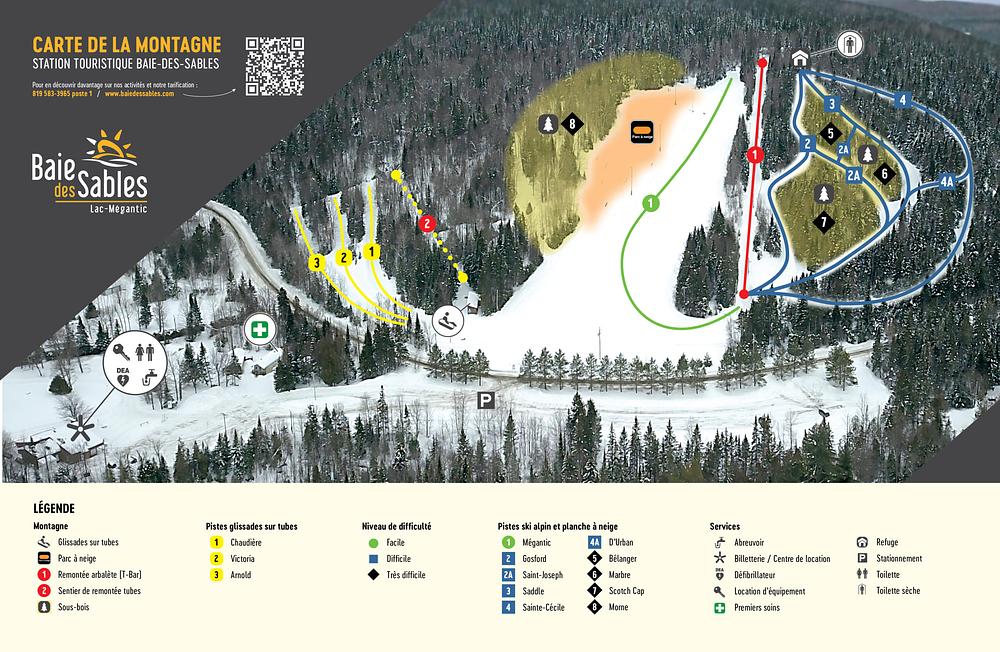 Baie des Sables is a family-friendly ski resort located in Lac-Mégantic, Quebec, Canada. It offers a variety of winter activities, including downhill skiing, snowboarding, cross-country skiing, and snowshoeing. The resort features a ski center, snowboard park, and tube sliding, as well as hiking and biking trails. Visitors can also enjoy the scenic views of Lac Mégantic and participate in activities such as fishing and hydrospeed. The resort has a campground with 347 sites, chalets, and pre-fabricated cabins available for rent.