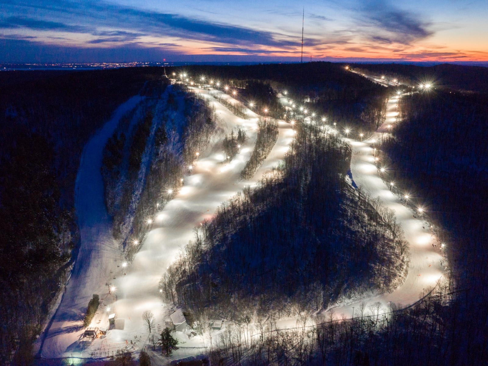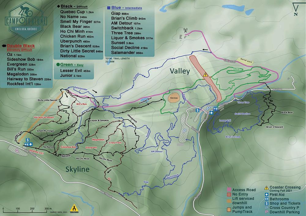 Camp Fortune is a commercial alpine ski centre located in Chelsea, Quebec, Canada, just 15 minutes from downtown Ottawa. It features 27 trails, a terrain park, and an aerial park with zip lines. The resort has a vertical drop of 180m and a skiable area of 38 hectares. With a variety of terrain for skiers and snowboarders of all levels, Camp Fortune offers a range of activities, including skiing, snowboarding, and zip lining. The resort has a full-service lodge with equipment rentals, a cafeteria, and a ski shop.