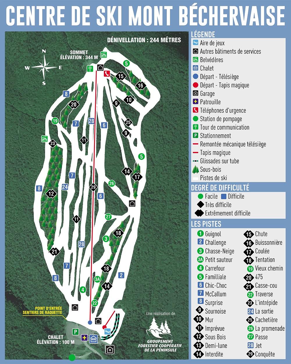 Centre de ski Mont Béchervaise is a ski resort located in Gaspé, Quebec, Canada. It offers a variety of slopes for all levels, with 29 trails and a 250-meter vertical drop. The resort is situated 5 km from downtown Gaspé and features a quad chairlift with a loading carpet. The ski resort is open for skiing and snowboarding, with 13 km of slopes available. The resort is also open for other activities in the summer and fall seasons.