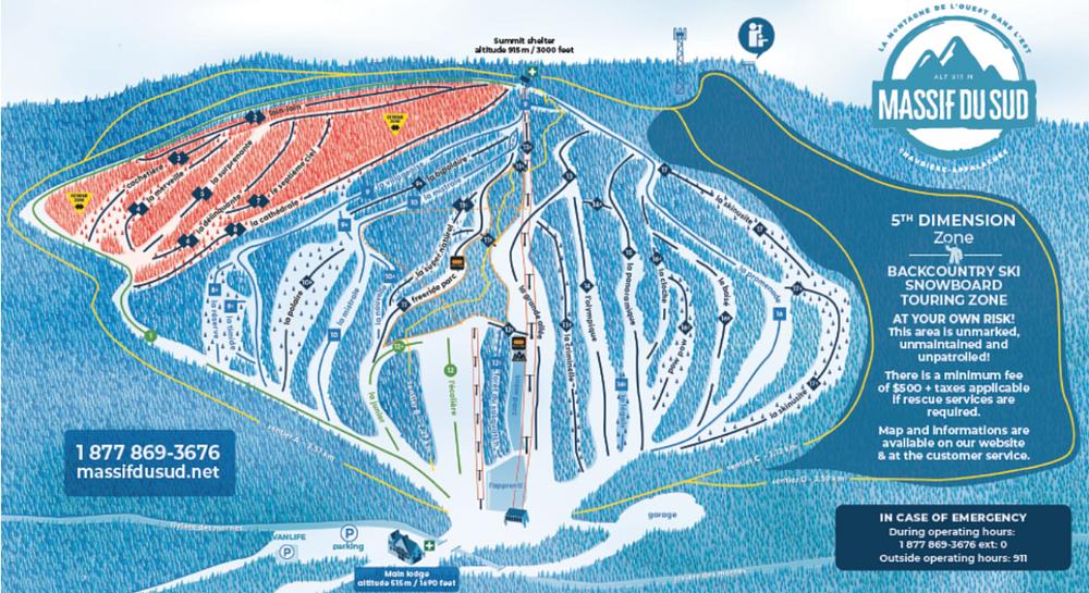 Massif du Sud is a ski resort located in Saint-Philémon, Quebec, Canada, about 90 km southeast of Quebec City. It boasts the highest summit elevation in Quebec, with 226 acres of skier and rider accessible terrain. The resort offers a range of activities, including downhill skiing, cross-country skiing, snowshoeing, and freeride skiing, as well as summer hiking and mountain biking. With 35 trails and a lift capacity of 1,600 skiers per hour, Massif du Sud is a popular destination for outdoor enthusiasts.