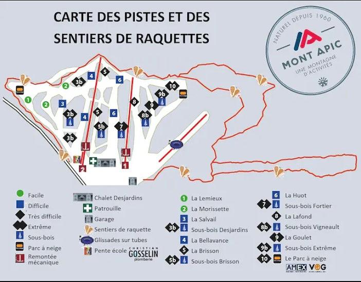 Mont Apic is a ski resort located in Saint-Pierre-Baptiste, Quebec, Canada. It offers 5 km of slopes with a vertical drop of 95 meters, 14 diversified runs, and 2 double T-bar lifts. The resort is suitable for all levels of skiers and snowboarders, with a conveyor belt for the school slope. Mont Apic also features tobogganing and winter sliding activities, including four runs with a vertical drop of 80 meters and a mechanical lift. The resort has a family-friendly atmosphere and is known for its positive impact on the community.