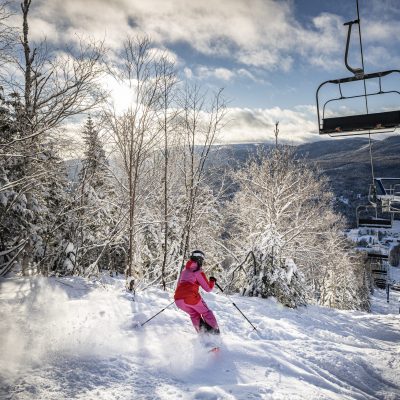 Mont Grand-Fonds is a ski resort located in the Charlevoix region of Quebec, Canada. It offers 14 alpine trails, 3 glades, and 1 teaching trail, as well as 3 training trails and a snow park. The resort has a vertical drop of 335 meters and is situated 14 km from downtown La Malbaie. Mont Grand-Fonds also offers cross-country skiing, snowshoeing, and snowmobiling, with 140 km of trails and 41 km of snowshoeing trails. The resort has a cozy pub and is known for its abundant natural snow and exceptional alpine skiing conditions.