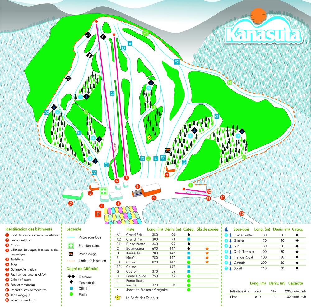 Mont Kanasuta is a family-friendly ski resort located in Abitibi-Témiscamingue, Quebec, Canada. It features 7.7 km of slopes, 12 slopes, and 8 glades, catering to both beginners and experienced skiers. The resort offers a variety of activities, including skiing, snowboarding, and lessons. Mont Kanasuta is situated 32 km west of Rouyn-Noranda and 6 km from the Ontario border, making it a convenient destination for those in the region.