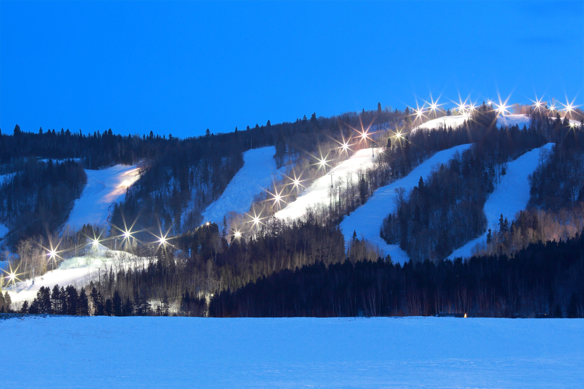 Mont Lac-Vert is a ski resort located in Hébertville, Quebec, Canada. It offers 19.6 km of slopes for skiing and snowboarding, with 3 lifts to transport guests. The resort is known for its night skiing, snow park, and tube slides, making it a popular destination for winter sports enthusiasts. In the summer, the area offers hiking and mountain biking trails. The resort is situated in the foothills of the Laurentians, providing a scenic backdrop for outdoor activities.