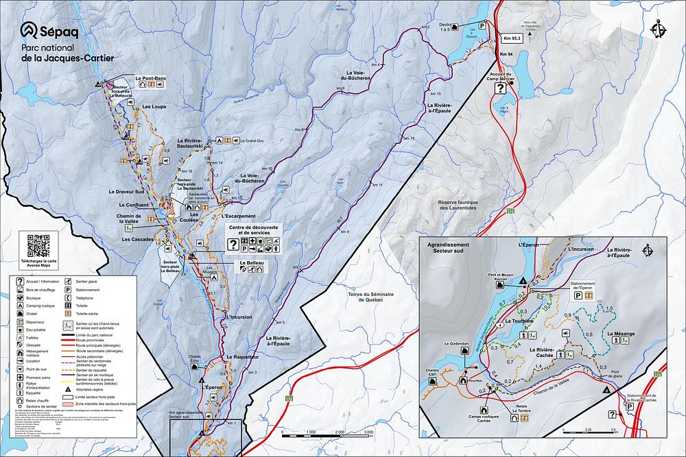 Parc national de La Jacques-Cartier is a national park in Quebec, Canada, featuring one of the most beautiful glacial valleys in the province. The park offers a range of outdoor activities, including hiking, snowshoeing, and skiing, with over 670 square kilometers of terrain to explore. Visitors can also enjoy the park's stunning scenery, including waterfalls, mountains, and forests. The park is easily accessible from Quebec City, with various accommodations and activities available, including a ski resort and a discovery center.