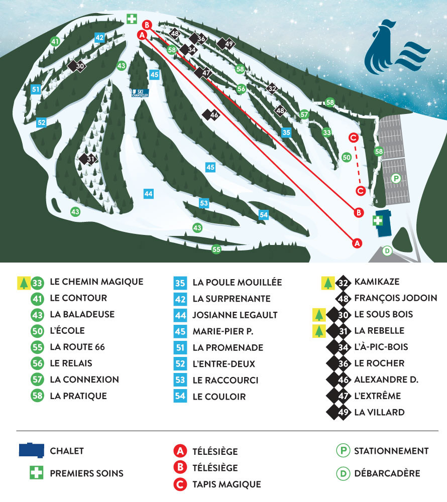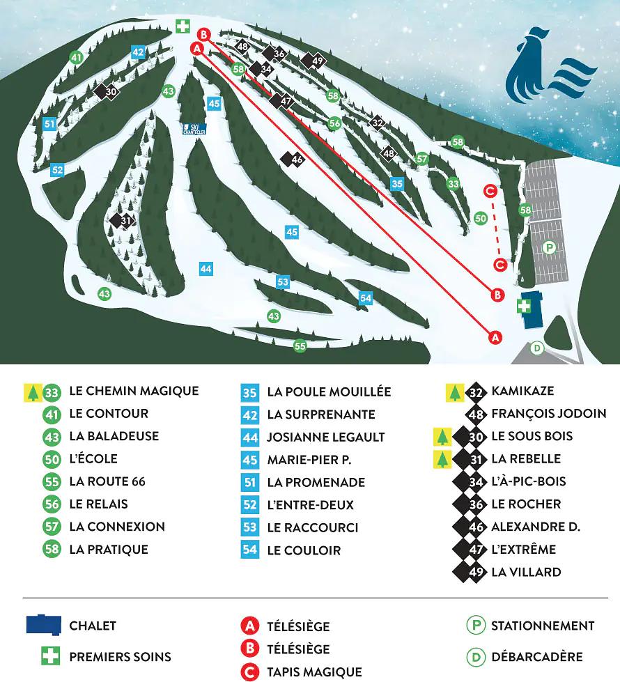 Ski Chantecler is a ski resort in the Laurentides region of Quebec, Canada, located just a few minutes from Sainte-Adèle and an hour from Montreal. The resort offers 25 trails, with 17 total trails, including 18% easy, 35% intermediate, and 47% difficult. The average annual snowfall is 381 cm, with 85% of the skiable area covered by snowmaking. The resort has been welcoming winter sports enthusiasts since 1970 and offers chair lifts, an après-ski cafe, and classes.