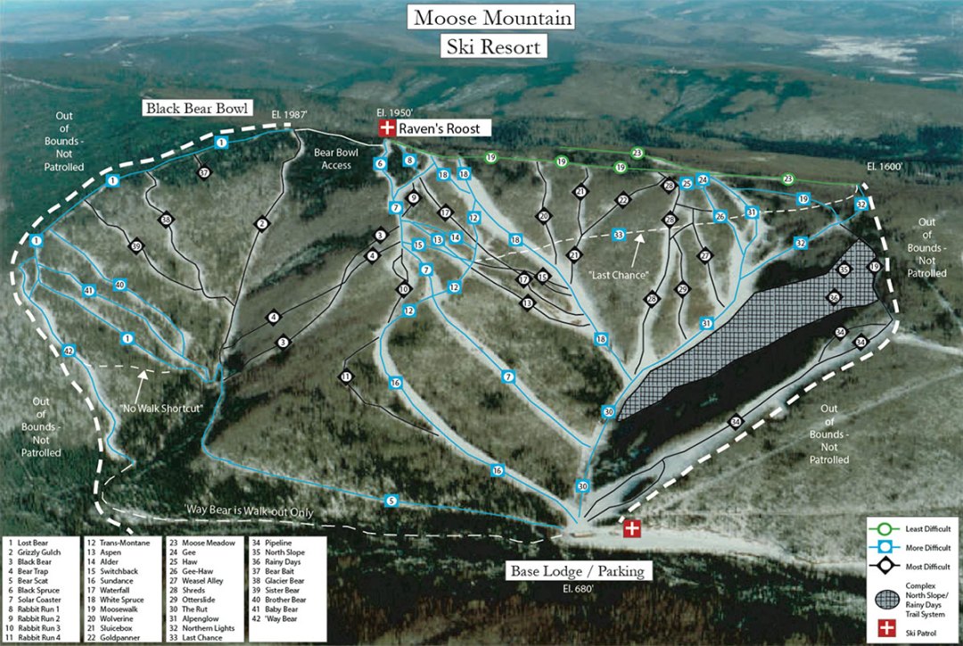 Moose Mountain is a ski resort located in Dawson City, Yukon, Canada. It features 1.9 km of slopes and 1 lift, including a T-bar lift. The resort is generally open when temperatures are above -20°C. Moose Mountain offers downhill skiing and snowboarding, as well as a chalet and rentals. It's a small, local hill serving the community of Dawson City.