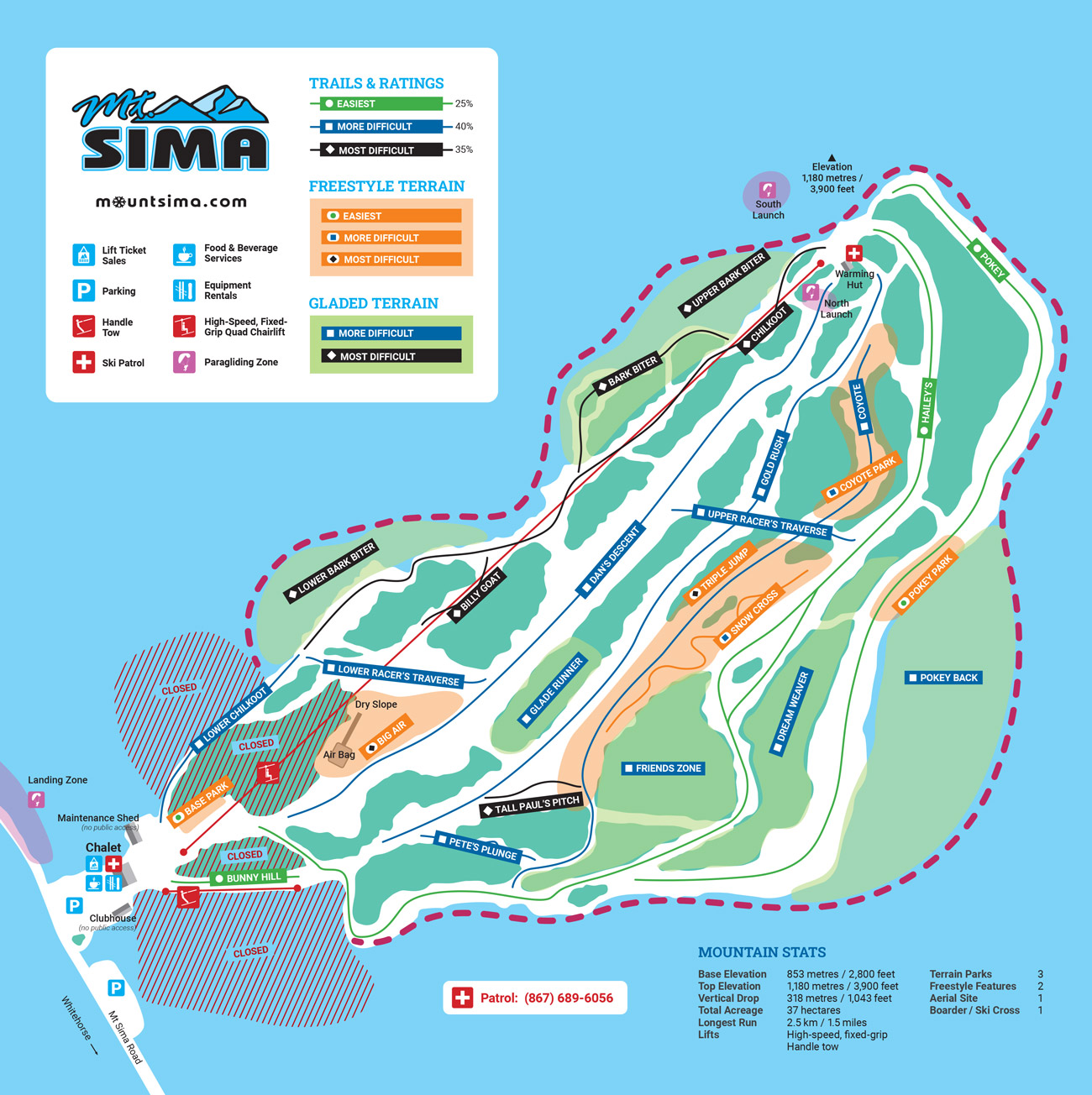 Mount Sima is a modest ski area in Whitehorse, Yukon, Canada, known for its freestyle terrain parks and summer mountain-biking opportunities. It offers 10 km of slopes for skiing and snowboarding in the winter, and downhill mountain biking in the summer. The resort is family-friendly, with a bunny hill and lessons available. It also features a cafeteria and rental equipment. Mount Sima is a non-profit ski hill, located just 15 minutes from downtown Whitehorse.
