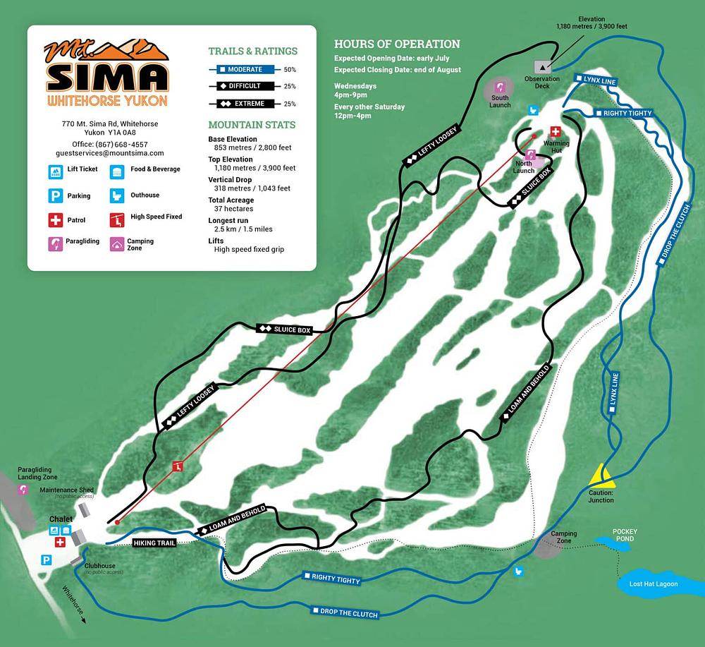 Mount Sima is a modest ski area located 15 minutes from downtown Whitehorse, Yukon, Canada. It offers year-round activities, including downhill skiing and snowboarding in the winter, and downhill mountain biking in the summer. The ski resort has 10 km of slopes and a freestyle terrain park. It's a popular spot for families and beginners, with a bunny hill and rental equipment available. The resort also offers glamping and children's activities in the summer.