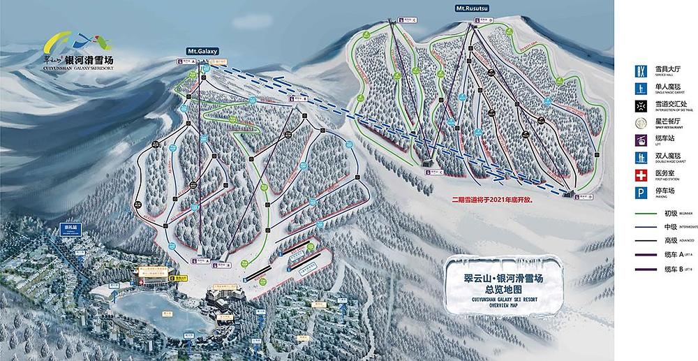 Cuiyunshan is a ski resort located in Chongli, China, within the Zhangjiakou area. It features a "Galaxy" themed holiday destination with a snow entertainment park, offering 9.1 km of slopes for skiing and snowboarding. The resort has a 6/8 Telemix lift, combining chair and gondola installations, and features amenities such as hot springs, spa, and bonfire areas. Cuiyunshan has received positive reviews, with an average rating of 4.4 out of 5 stars on Trip.com and 4.5 out of 5 stars on Tripadvisor.