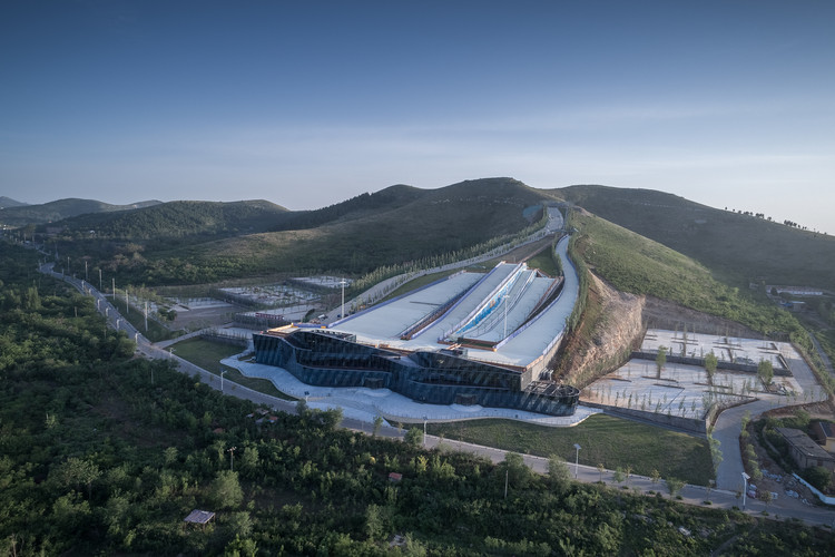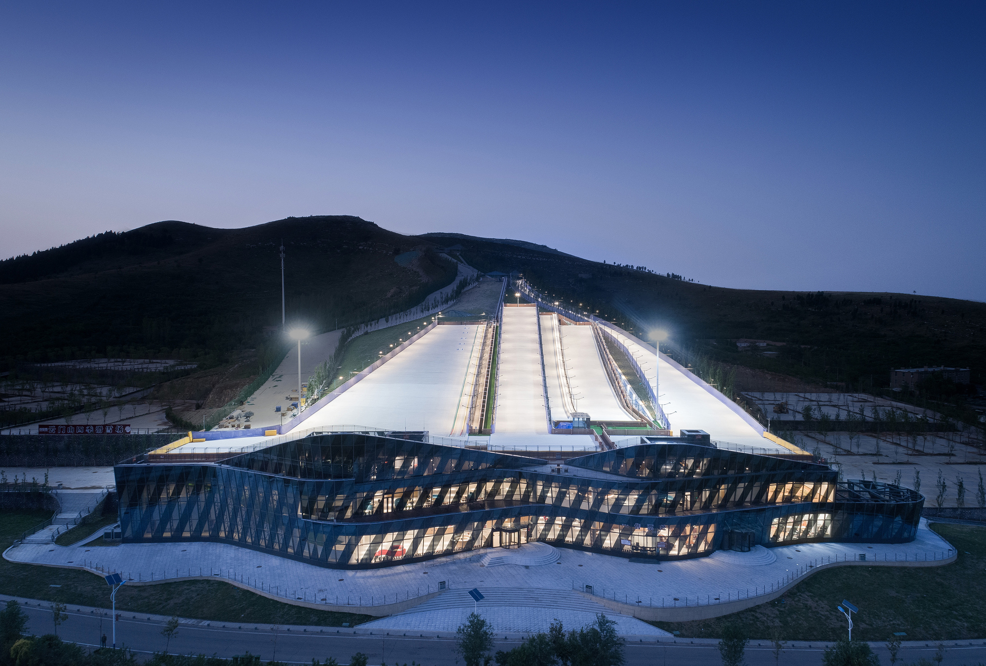 Yunmen Mountain is a ski resort located in the Qilu Mountain Region of China, near Qingzhou. It offers skiing, snowboarding, and tubing on artificial slopes, with three large elevators and observation points providing views of the field. The resort was designed by ATAH and MADA and completed in 2018. It has been used to train Olympic teams during the snow-free season and features a viewing terrace on the roof of the service area.