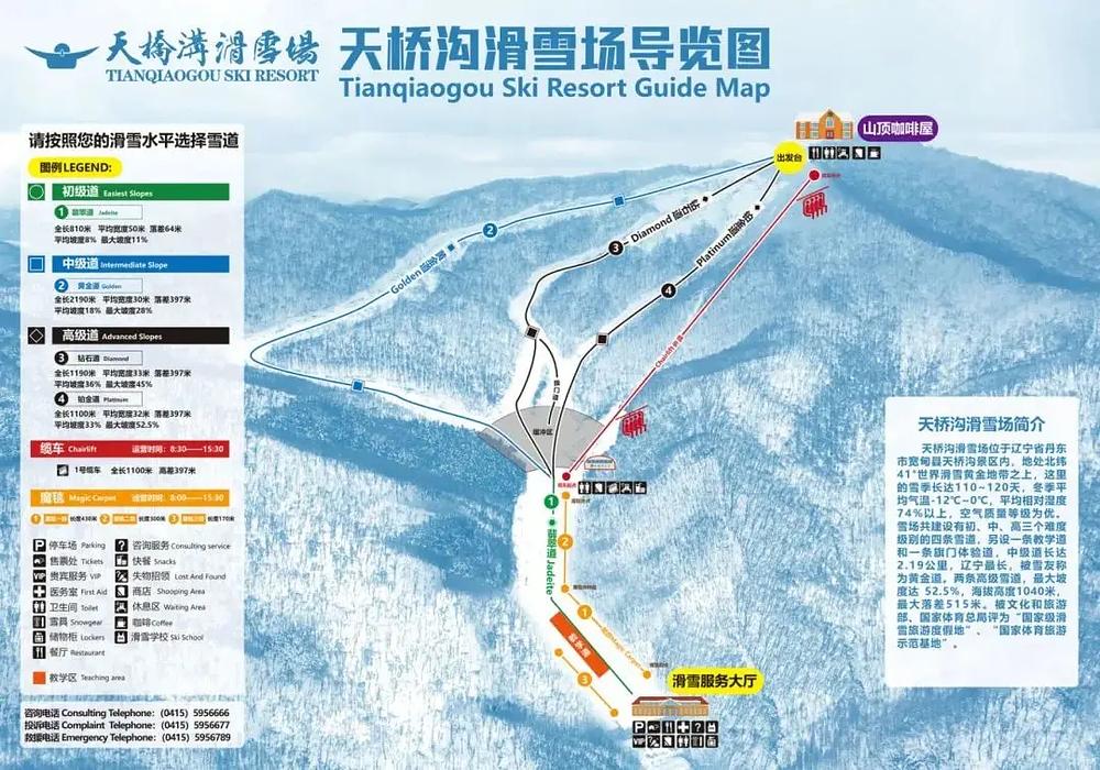 Tianqiaogou Ski Resort, located within Tianqiaogou Forest Park, is situated on the Laoling branch of Changbai Mountain, at a latitude of 41 degrees, the same as the famous ski destination, the Alps. The resort has three levels of difficulty and a total area of 130,000 square meters, with advanced snow-making and snow-grooming equipment. It boasts a long snow season of 150 days, making it the longest in Liaoning Province, with excellent snow quality and a wide range of snow-covered trails. The resort's altitude is 1,040 meters, offering a unique and enchanting winter wonderland experience.