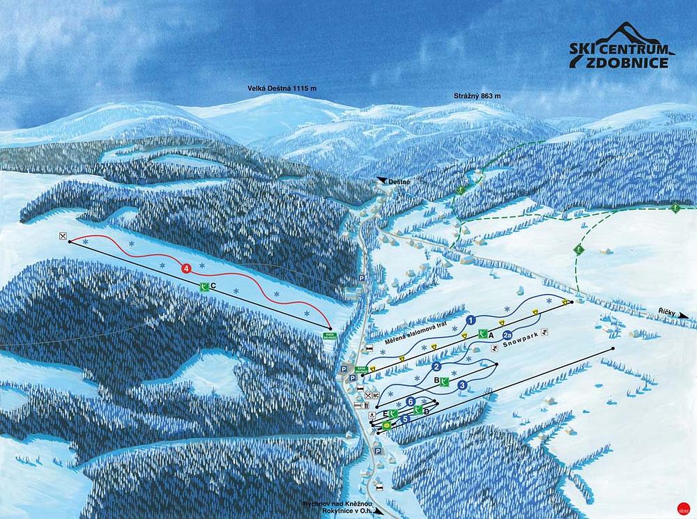 Zdobnice is a ski resort located in the Hradec Králové Region of the Czech Republic. It offers 1.9 km of slopes and 6 lifts, with a vertical drop of up to 680m. The resort is situated in the Orlické hory mountains, 16km from Rychnov nad Kněžnou. Zdobnice has four ski slopes and three lifts, and is known for its lively après-ski scene and luxurious amenities.
