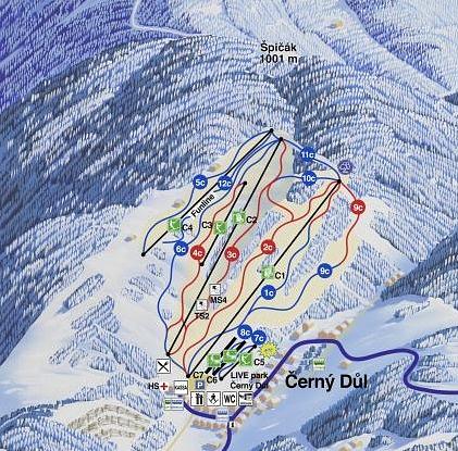 Černý Důl is a ski resort located in the Hradec Králové Region of the Czech Republic. It offers 7 km of slopes for skiers of all levels, including a fun course and a timed giant slalom course. The resort has 6 ski lifts and a modern kids' park. Ski rental is available, and there is no parking fee. The resort is situated 0.4 km from the village center.