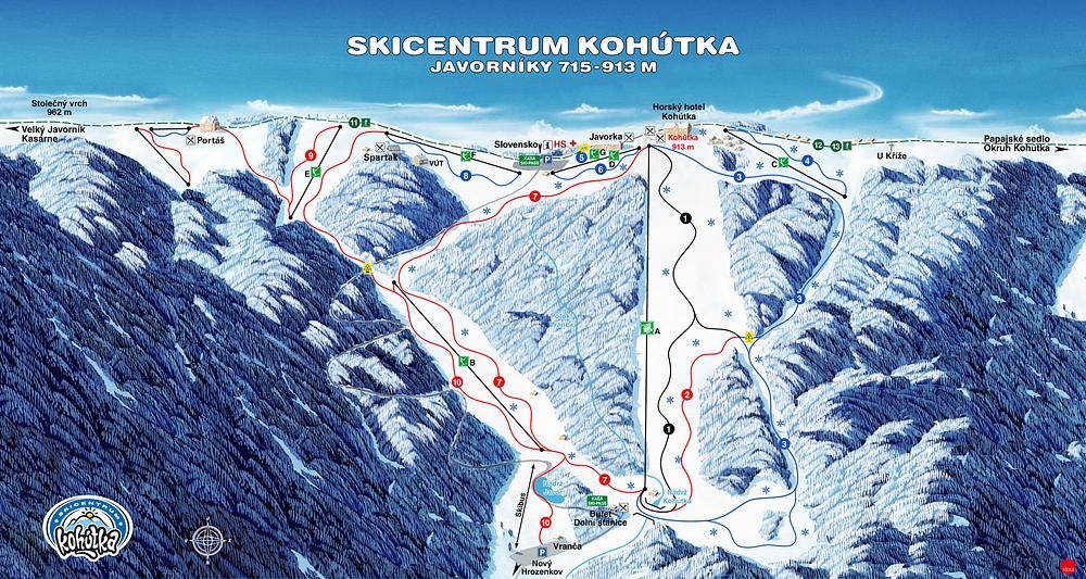 Kohútka is a ski resort located in the Javorníky mountains, on the border between the Czech Republic and Slovakia. It offers 6.5 km of slopes, 7 lifts, and a variety of winter sports activities, including night skiing and a kids' park. The resort has a four-seat lift and a range of equipment and services available. It is situated at an altitude of 913m and is a popular destination for family-friendly winter sports.