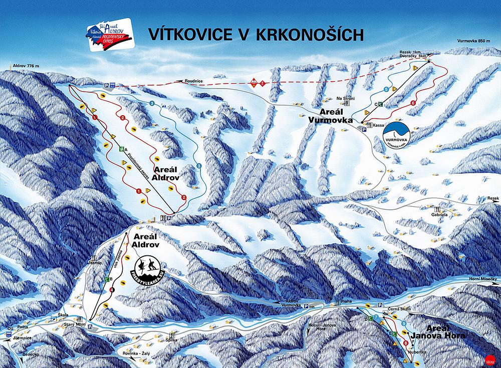 Aldrov - Prezidentský expres is a ski resort located in Vítkovice, Czech Republic, in the Liberec Region. It features 4.5-star accommodations, 3.3 km of slopes, and 3 lifts, including a chairlift and a four-seater cable car called the Presidential Express. The resort offers a range of skiing and snowboarding opportunities, with slopes suitable for all skill levels.