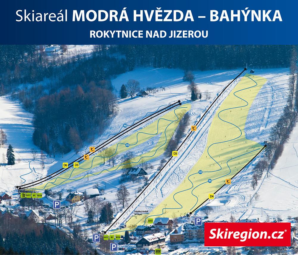 Modrá hvězda - Bahýnka is a ski resort located in Rokytnice nad Jizerou, Czech Republic. The resort offers skiing and snowboarding opportunities on 1.1 km of slopes, with a height difference of 150m. The ski season typically runs from mid-December to late March, with opening hours from 9:00 to 16:00. The resort is situated near the square in Horní Rokytnice nad Jizerou, within walking distance from the last bus stop.