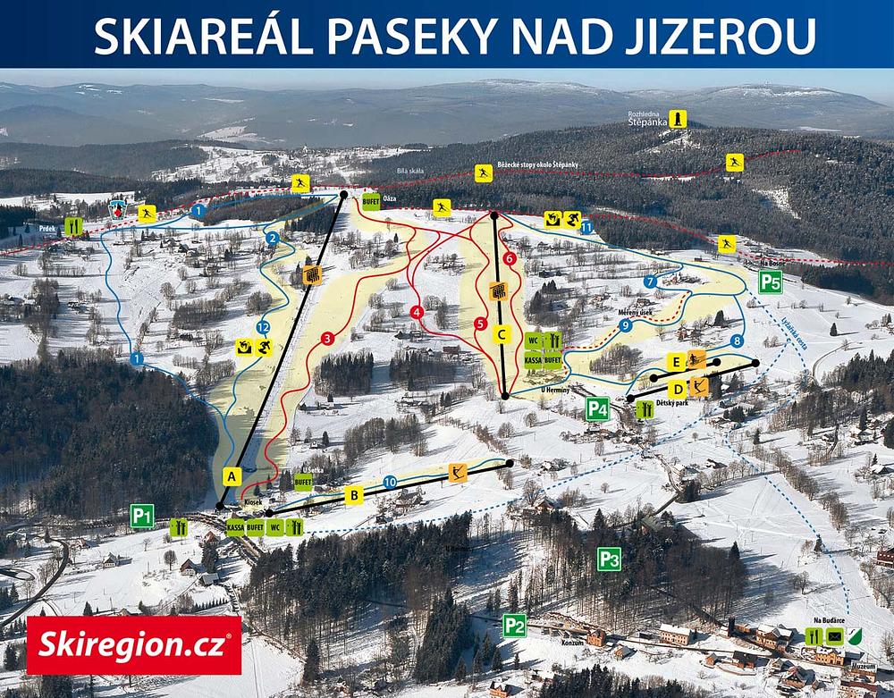 Paseky nad Jizerou is a family-friendly ski resort located on the border of the Krkonoše and Jizera Mountains in the Czech Republic. It offers 9.6 km of slopes with 5 lifts, including a chairlift, and a snowmaking system. The resort has a vertical drop of 240 meters and is suitable for skiing and snowboarding. The area is easily accessible from Liberec, just under an hour away.