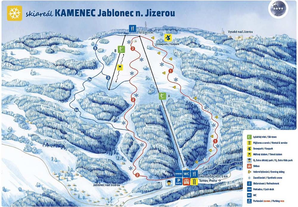 Skiareál Kamenec is a ski resort located in Jablonec nad Jizerou, Czech Republic, in the Liberec Region. It offers 3 km of slopes for skiing and snowboarding, with 2 lifts and a free snowpark with a boardercross track. The resort is known for its artificial snowmaking and night skiing. It also features a slalom track, ski and snowboard rental, and a restaurant near the ski lift bottom station. The resort is open on certain days, with evening skiing sessions on Wednesdays, Fridays, and Saturdays.