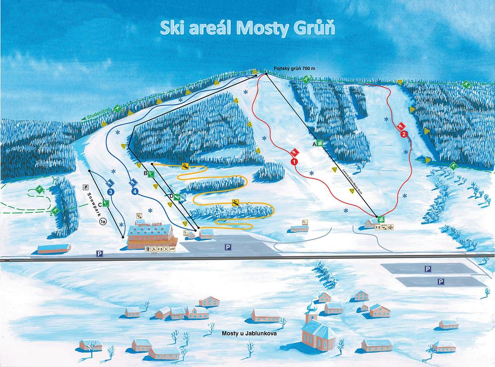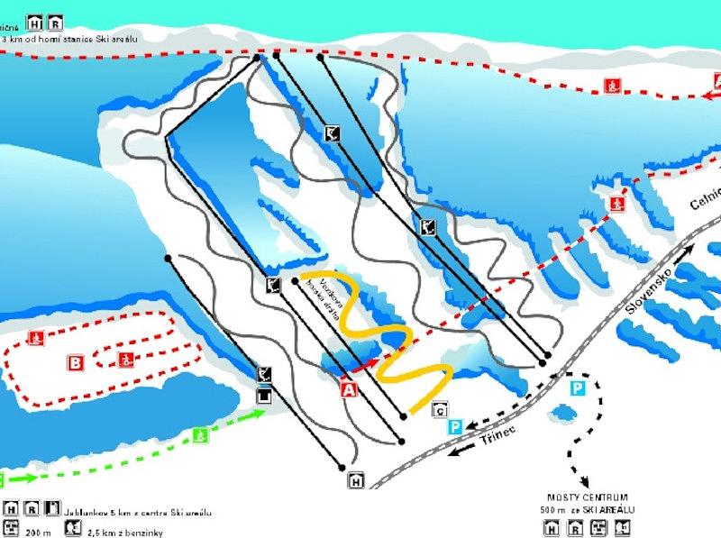 Mosty u Jablunkova is a ski resort located in the Moravian-Silesian Region of the Czech Republic. It offers skiing, snowboarding, and ski holidays, with a main ski area situated 0.7 kilometers from the village center. The resort features a terrain park with ski runs, and accommodations are available in nearby hotels and chalets.