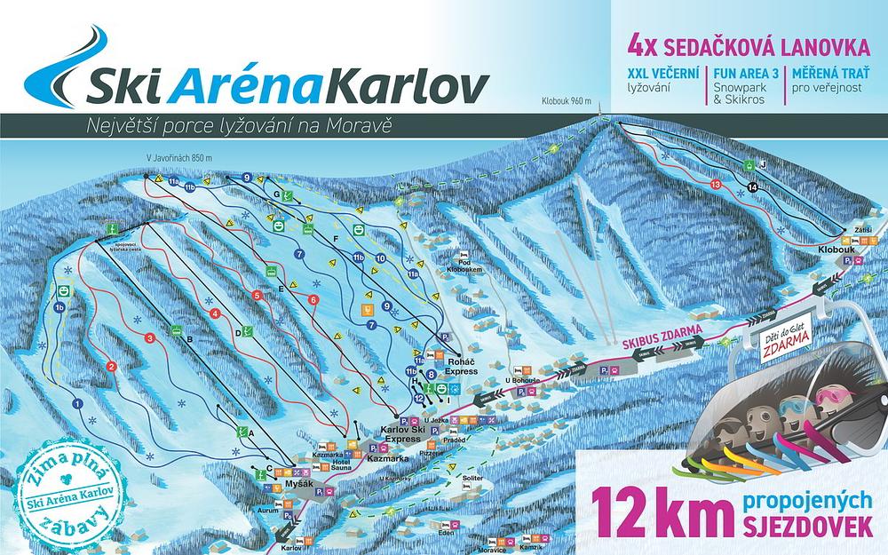 Ski Arena Karlov is a popular ski resort located in the heart of the Jeseníky Mountains in the Moravian-Silesian Region of the Czech Republic. It offers 12 km of interconnected slopes for all skill levels, 4 chairlifts, and the longest evening skiing in Moravia. The resort also features a cross-country ski trail network of 70 km and a bike park. With a capacity to transport over 11,000 people per hour, Ski Arena Karlov is a great destination for skiers and snowboarders of all levels.