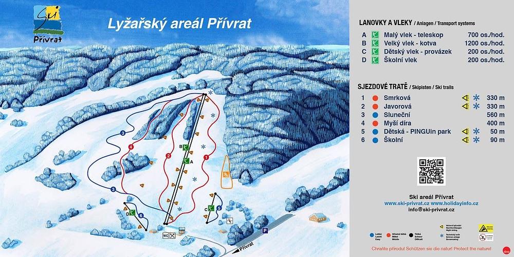 Here's a 50-100 word summary of Přívrat: Located in the Pardubice Region of the Czech Republic, Přívrat is a ski resort offering 1.8 km of slopes for skiing and snowboarding. The resort is situated 0.7 km from the village center and features 2 ski lifts. In the summer, Přívrat offers a summer toboggan run, go-karts, and a children's play area. The resort also has a restaurant and bar on site. With its modern facilities and beautiful surroundings, Přívrat is a great destination for families and winter sports enthusiasts.