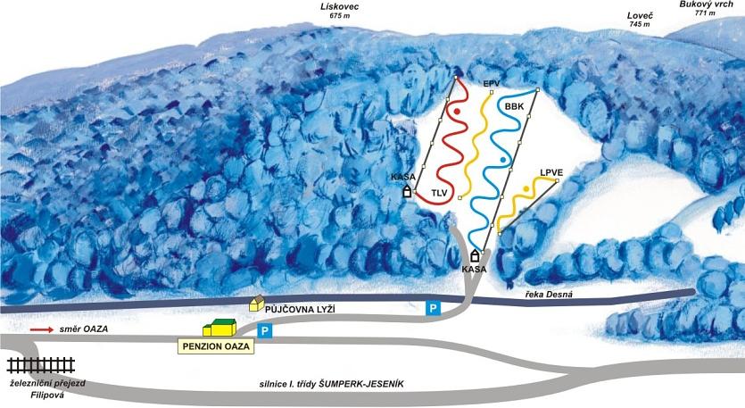 Ski Centrum Oáza is a ski resort located in Loučná nad Desnou, Czech Republic. It offers 1.3 km of slopes, 4 lifts, and a ski school. The resort is situated between 800 and 1,200 meters in elevation and features man-made snow and groomed slopes with night skiing. The ski center is operated by Penzion Oaza, which also offers accommodation and other amenities.