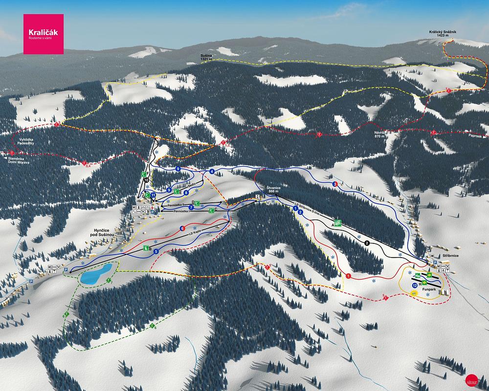 Ski Králičák is a ski resort located in the Hrubý Jeseník mountains of the Czech Republic. It offers 7 km of ski slopes, a fun park, and a ski school. The resort is open daily from 8:30 AM to 4:00 PM and features a D-line cable car, a Kaple chairlift, and a Sedlo tow lift. The resort is suitable for skiers and snowboarders of all levels, from beginners to advanced.