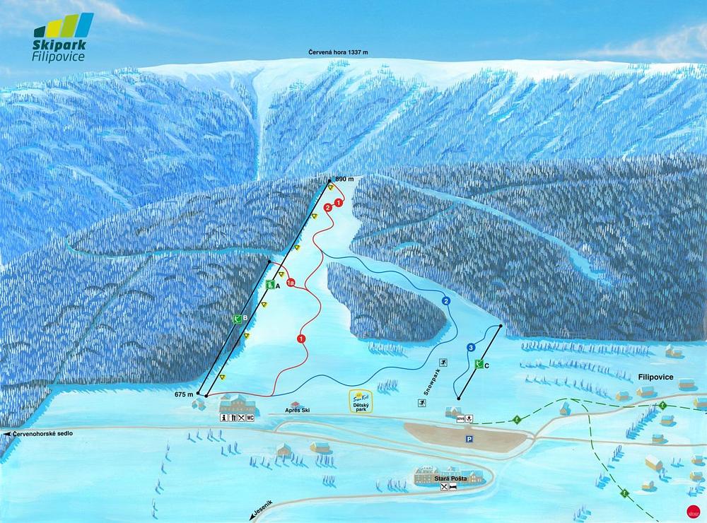 Skipark Filipovice is a ski resort in Bělá pod Pradědem, Czech Republic, offering 2.6 km of slopes for skiing and snowboarding. The resort has 3 lifts and a family-friendly atmosphere, making it an ideal destination for families with children. The ski resort is situated 2.7 km from the village center and provides a range of services, including a restaurant.