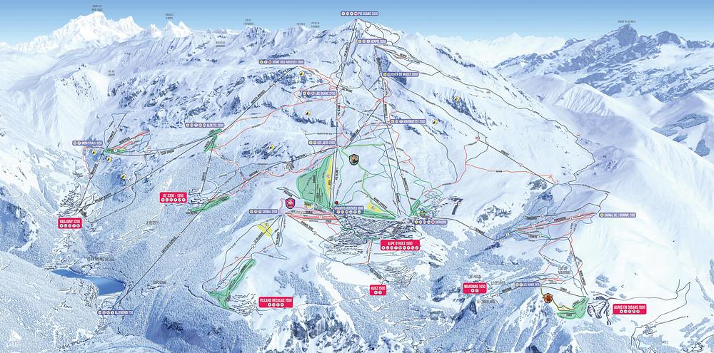 Alpe d'Huez Grand Domaine is a thriving year-round resort in the French Alps, offering 250 km of pistes for all levels, with a south-facing orientation and a 360° panorama from the summit of Pic Blanc (3,330m). The resort has a lively après-ski scene and a range of activities for summer and winter, including skiing, hiking, and mountain biking. With 159 trails and a variety of accommodations, Alpe d'Huez is a popular destination for families and thrill-seekers alike.