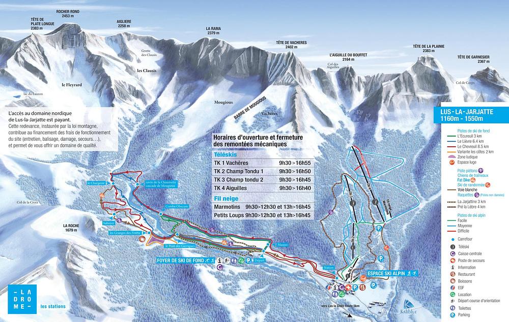 Lus la Jarjatte is a ski resort located in the French Alps, specifically in the Drôme department. It offers 11 trails, including 6 alpine ski runs and 20 km of Nordic ski trails. The resort is situated at an elevation of around 1100m, near the source of the river Buëch. It features a range of facilities, including 5 ski lifts, a ski school, and a variety of accommodation options. The resort is known for its family-friendly atmosphere and offers stunning views of the surrounding mountains.