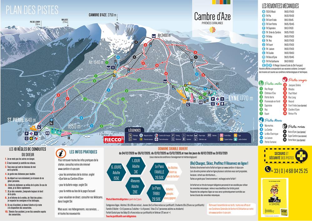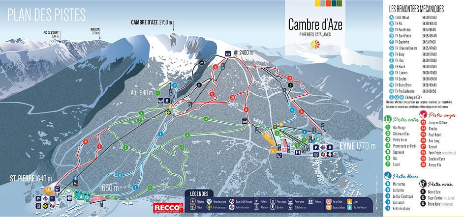 Espace Cambre d'Aze is a ski resort located in the Pyrenees mountains of France, between the villages of Eyne and Saint-Pierre-dels-Forcats. It offers 23 marked runs for all levels, 22 km of slopes, and 2 beginner areas, as well as snowshoe circuits and sledging areas. The resort has 13 lifts and a total of 25 trails, making it a great destination for skiers and snowboarders. The area is known for its varied terrain and stunning mountain scenery, with elevations ranging from 1,640 to 2,400 meters.